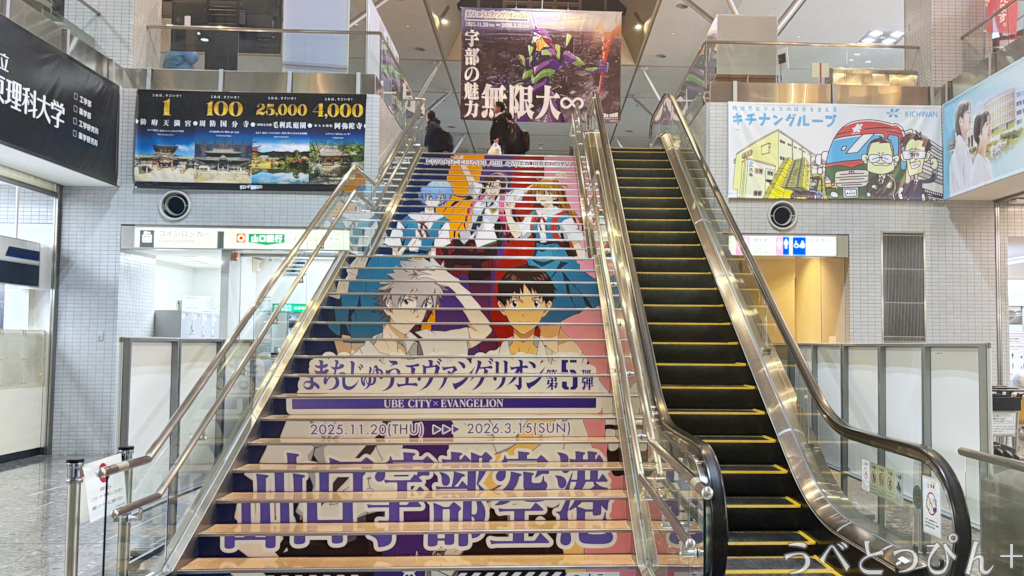 山口宇部空港では、期間中、中央階段がエヴァ仕様になっていますので、空港にお越しの際はお見逃しなく!